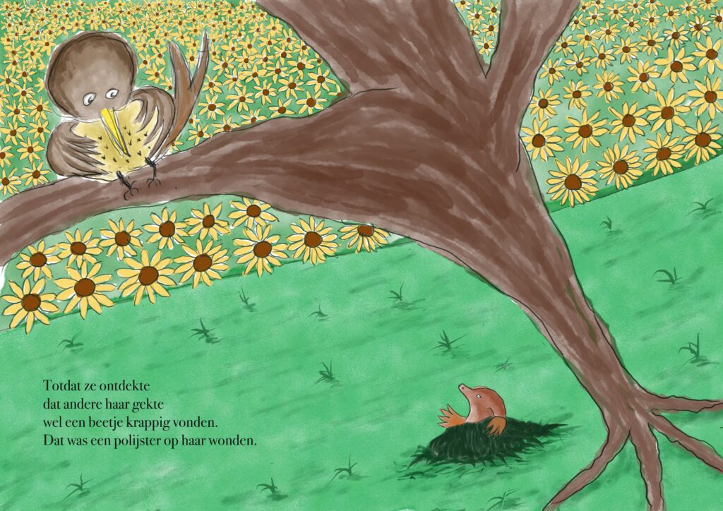 Ik had twee jaar gelden bedacht dat het een Mol was, gewoon omdat ik het toen leuk vond die te tekenen. Die Mol verdween in de versie van vorig jaar. Maar ik bij zó blij dat doe weer terug is. Want ik vind het nu heel veel betekende dat degen die Liedwij voor het eerst echt ziet, uit de grond komt. Een Mol. Die weet hoe het is om weggedoken te zijn onder de grond. Iemand die weet van de diepte.