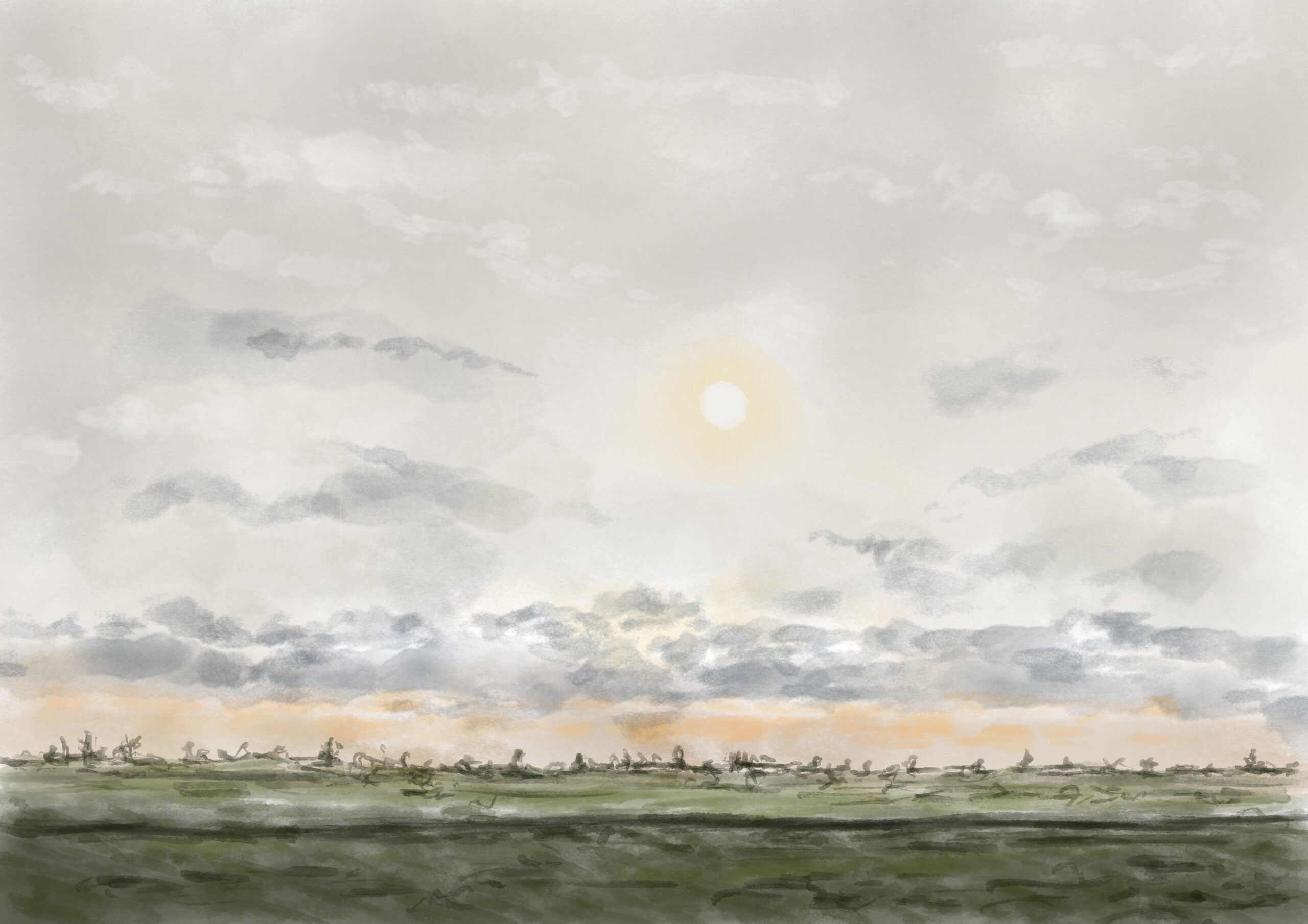In de tekening vanaf mijn balkon besefte ik later pas dat het mist actief effect beter tot zijn recht kwam als ik dat meer als stralen liet zien.