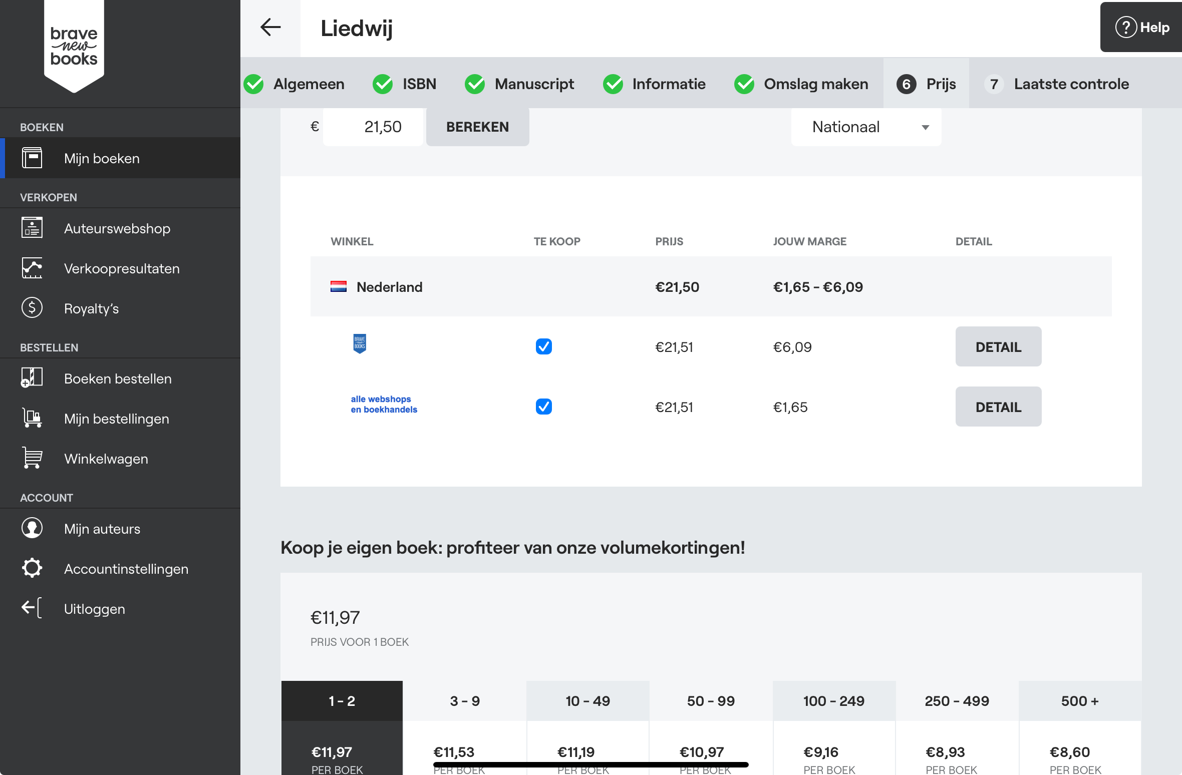 Ik wil best een lagere marge, maar dat kan alleen als ik ervoor kies dat het niet via boekhandels of online winkels te koop is. Die willen namelijk ook een marge. Boekhandels gun ik dat graag.